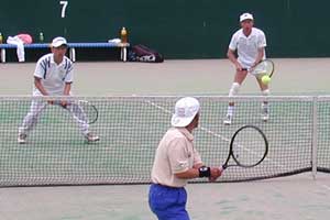 第1セット、村上選手の強力なリターンが決まり、村上・森組が、6−4で先取。 しかし、第2セット終盤、神保・友野組はストロークで粘りをみせ、 7−5で奪い返し、第3セットに勝負をもちこんだ。 第3セットに入ると村上選手の強力なリターンやストロークに加えて、 森選手のうまい攻撃も加わり、粘る神保・友野組を6−2で振り切って、 優勝を決めた。 |