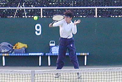 戦いとなった。 期待通りの見ごたえのあるラリーの応酬がつづき、 第1セットは7−5で和田、第2セットは6−4で榎本がとり、 勝負は最終セットにもちこまれた。 最終セットにはいり、榎本選手が疲労で動きが悪くなり、 1−3で足にけいれんをおこし、リタイア。和田選手が決勝進出を決めた。 |