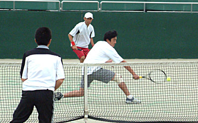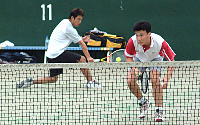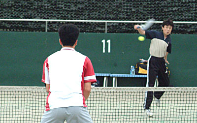 | 準決勝第1試合、藤代・遠藤組は、遠藤選手の強力なサーブと 藤代選手のネットプレーでの攻め。神部・安部組は、 コントロールショットで切り返す展開。 最後まで目を離せない試合だったが、要所のポイントをつかんだ 神部・安部組が、7−5,7−5で決勝進出を決めた。 | |