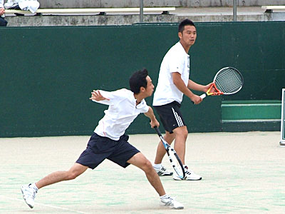 神部・関組が6−2で奪取。 第2セット、神部・関組3−2リードでむかえた第6ゲーム。 ゲームポイントを先に握られながらも、ジュース(ノーアド)の末確保。 続く第7ゲームもジュースの末奪い、大石・高橋組の粘りもここまで。 結局、6−2,6−3で優勝を飾った。 | |