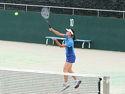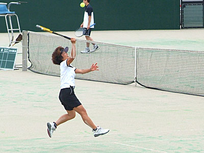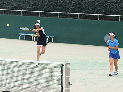 確実な攻めで、深津・森川組が先取した。 第2セットにはいってもペースが変わらず、そのまま深津・森川組が 6−4,6−1で押し切った。 | |