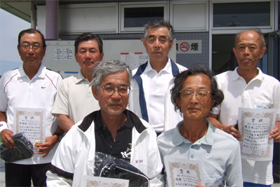 男子65才以上クラスは、高橋・大沼組に8−6で競り勝った田中・辻組が優勝。 男子Bクラスは、本村・多田組が優勝。2位は、9−8で勝利した阿部・松永組。 | |