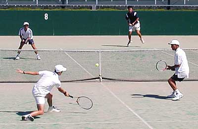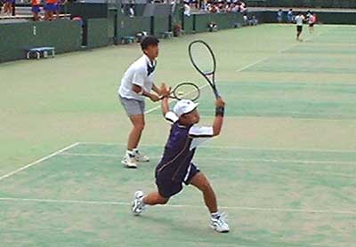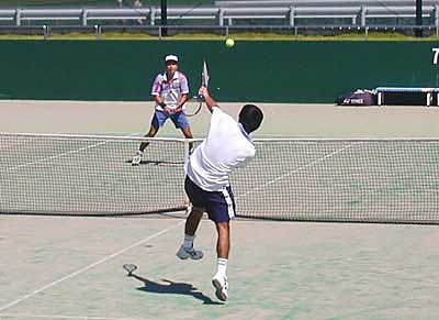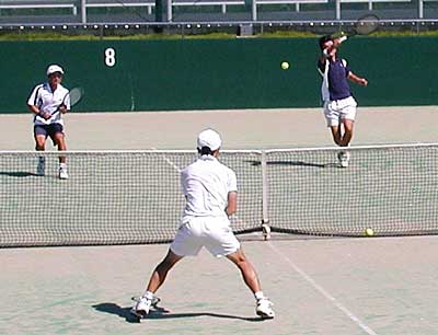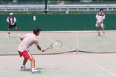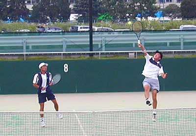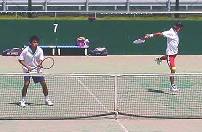 遠藤・安部組が、1st6-2ととり、さらに2ndも4−1とリード。 しかし、ここから大石・安波組が粘りのテニスを展開。じりじりと追い上げ、 ついに4−4と追いつき、さらに次のリターンゲームも15-30とリード。 しかし、このゲームをしのがれ、その後も粘ったものの、タイブレークの末、敗退した。 |