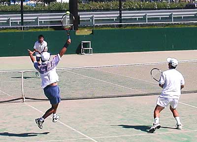 勝俣・神部組にペースをつかませず、1stを6−2で先取した。 しかし、2ndにはいり、勝俣・神部組の攻めのテニスが復活し、 5−3とリードした。ここで神部選手のサービスゲームで、2ndをとるかと 思われたが、このゲームをブレークされ、5−4、5−5と追いつかれた。 こうなると、遠藤・安部組のペース。勝俣選手のサービスゲームも0−40と ブレークチャンス。40−40まで挽回されたが、つぎのポイントをとり、 6−5と遠藤・安部組がリード。そのまま7−5で押し切り、市民大会に続いて 優勝した。 |
