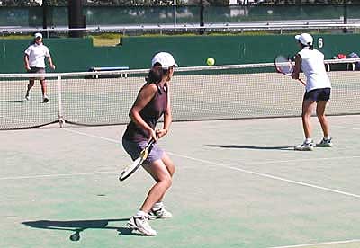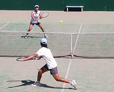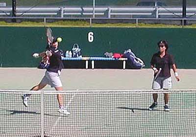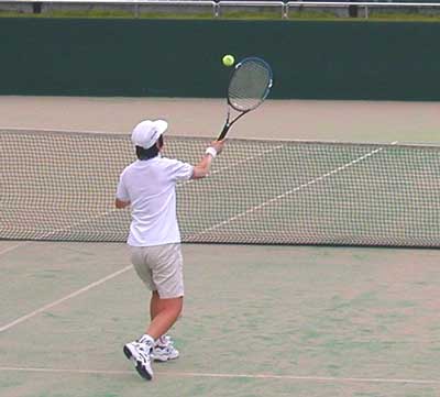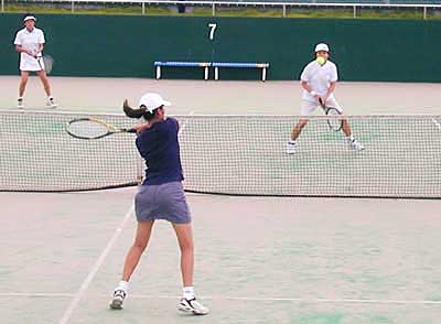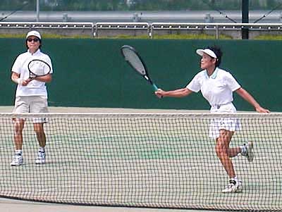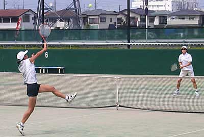 | 準決勝第1試合は、 二宮・工藤組は、昨年優勝の朝尾・近藤組に対して、ボレーで対抗。 コントロールのいいボレーが最後まで途切れず、6−3,6−3で快勝した |