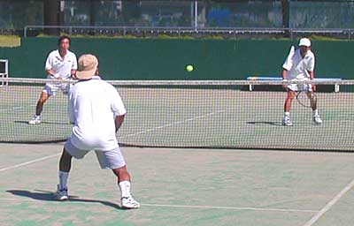 第1セット、村上選手の強力なショットで、森・村上組が4−3とリード。 しかし、ここから、岩本選手が切れのいい動きでゲームを支配。逆転で このセットをとると、第2セットにはいっても、要所を岩本・内田組がおさえ ストレートで優勝を決めた。