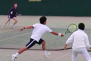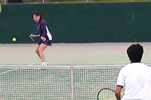 第1セット、村上選手の強力なリターンが決まり、村上・森組が、6−4で先取。 しかし、第2セット終盤、神保・友野組はストロークで粘りをみせ、 7−5で奪い返し、第3セットに勝負をもちこんだ。 第3セットに入ると村上選手の強力なリターンやストロークに加えて、 森選手のうまい攻撃も加わり、粘る神保・友野組を6−2で振り切って、 優勝を決めた。 |