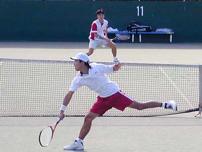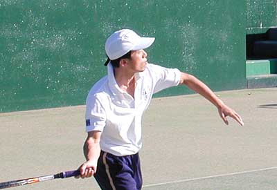 神部は、立ち上がりから丁寧なストロークを展開。一進一退の攻防がつづいた。 5−4とリードした神部だったが、再度安部が逆転し6−5。ここで神部のサービスゲーム。 サービスダッシュを含むネットプレーを積極的に展開し、タイブレークへ。 タイブレークでもネットプレーを的確に決めた神部が第1セットを7−6で先取した。 第2セットも一進一退の攻防が続き、神部が5−4でリード。両者ともに足にけいれんがきはじめていた。 ジュース(ノーアド)となったポイント。神部のマッチポイントだったが、パッシングショットはアウト。 さらに5−5でもジュースとなりやはり安部がとり、7−5で安部がセットカウントをタイに持ち込んだ。 ファイナルセットは、両者ともに足のけいれんで動くことができず、苦しい試合展開。 5−3神部リードでむかえた第9ゲーム。神部のサービスゲームを、30−40とリードされたが、 サービスダッシュで安部のリターンはアウト。再びマッチポイントを握ったが、 勝負をかけて思い切りよく打ったセカンドサーブはフォールト。5−4と安部が粘りを見せた。 両者ともに消耗しきった展開は、続く第10ゲーム、神部が最後の力を振り絞ってとり、 3時間を越えた試合にようやく決着をつけた。 |