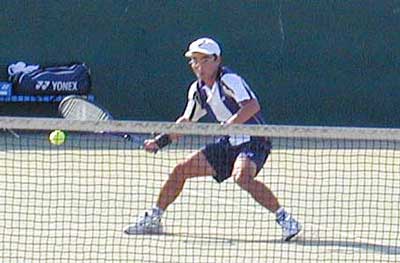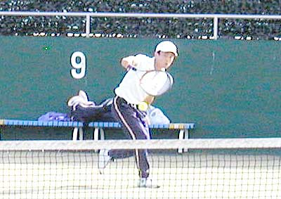 遠藤のボレーミスなども重なり、第1セットは大石が簡単に6−0で先取。 しかし、ここから遠藤が得意の粘りのテニスを展開。長いラリーを繰り返し、 競り合いの展開にもちこんだ。4−3遠藤リードでむかえた第8ゲーム、30-40で大石リードだったが 大石のボレーを拾いまくり、遠藤が逆転でこのゲームをとり、つづくゲームもとって、 ファイナルセットへ。 ここで負けたくない大石も、第1ゲームを取り返し、第2ゲームへ。ここで ここまでの粘りで体力を消耗した遠藤が、サービスで足にけいれんをおこし、 さらに3−0大石リードとなったところで、リタイア。大石が決勝進出を決めた。 |