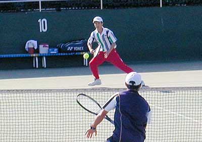 大石選手のミスをしないテニスが優勢で6−3と大石が先取した。 第2セットにはいり、神部が準決勝の疲労から足が動かなくなったが、 ダウンザラインへのエースをきめるなどで、6−2ととってファイナルセットへ。 しかし、神部の足の消耗は激しく、ほとんど走れない状態。大石は、無理にボールを追わず 淡々とボールを打ち返し、6−1でとり、大石が優勝。5連覇を達成した。 |