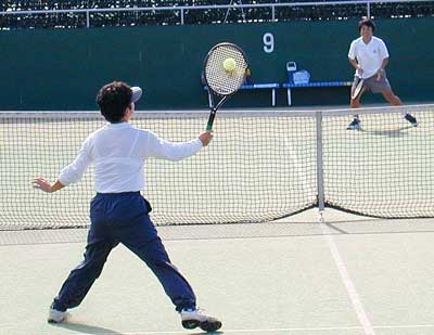 | 決勝戦は、ともに強力なストロークをもつ和田選手と高西選手。 序盤から激しい打ち合いとなったが、ペースをつかんだのは高西。 左右に繰り出すショットが面白いように決まり、一気に4−1とリード。 和田選手もなんとかボールを散らして抵抗するが、6−1と第1セットを失った。 第2セットにはいっても高西選手のストロークはさえ、さらに粘る和田に対しては ボレーで抵抗を許さず、第2セットも6−2でとり、初優勝を決めた。 |
