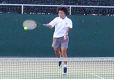 戦いとなった。 期待通りの見ごたえのあるラリーの応酬がつづき、 第1セットは7−5で和田、第2セットは6−4で榎本がとり、 勝負は最終セットにもちこまれた。 最終セットにはいり、榎本選手が疲労で動きが悪くなり、 1−3で足にけいれんをおこし、リタイア。和田選手が決勝進出を決めた。 |