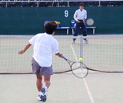 準決勝第2試合は、 森選手と高西選手。ともに初日の2回戦で7−6,6−4という厳しい戦いを 勝ち抜いてきた。森は、3回戦もフルセットの戦いとなり、昨年準優勝の神部選手を ストレートで下した高西が強打で森選手を下した。 |