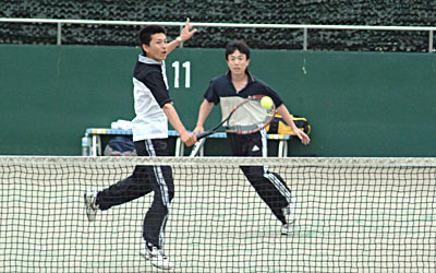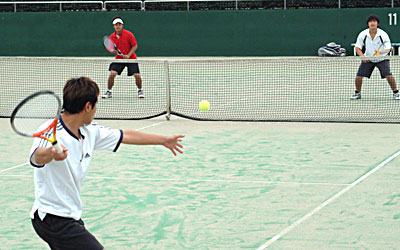 | 準決勝第1試合、藤代・遠藤組は、遠藤選手の強力なサーブと 藤代選手のネットプレーでの攻め。神部・安部組は、 コントロールショットで切り返す展開。 最後まで目を離せない試合だったが、要所のポイントをつかんだ 神部・安部組が、7−5,7−5で決勝進出を決めた。 | |