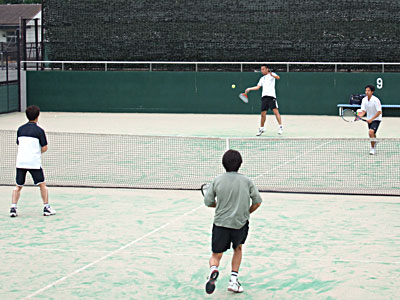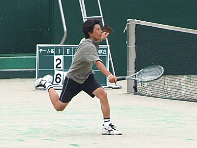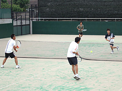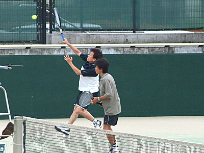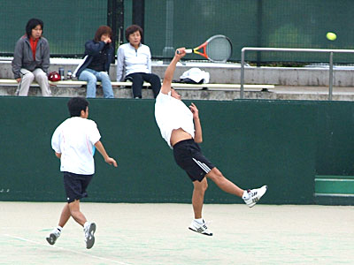 神部・関組が6−2で奪取。 第2セット、神部・関組3−2リードでむかえた第6ゲーム。 ゲームポイントを先に握られながらも、ジュース(ノーアド)の末確保。 続く第7ゲームもジュースの末奪い、大石・高橋組の粘りもここまで。 結局、6−2,6−3で優勝を飾った。 | |