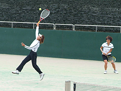 確実な攻めで、深津・森川組が先取した。 第2セットにはいってもペースが変わらず、そのまま深津・森川組が 6−4,6−1で押し切った。 | |