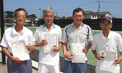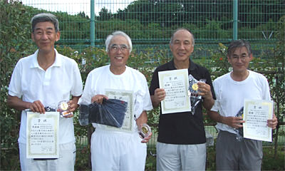 第2セット、第3セットと、臼井・西組が奪い返して、逆転で優勝した。 65歳以上は、高橋・岡田組が、第1セットをとったものの、第2セットでは押し切れない。 タイブレークで第2セットを落として、こちらもファイナルセットへ。 ファイナルセットは勢いにのるかと思われた田中・辻組だったが、乗り切れない。 結局、高橋・岡田組がこのセットを奪い返して優勝した。 | |