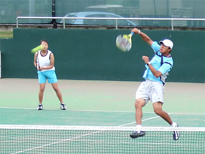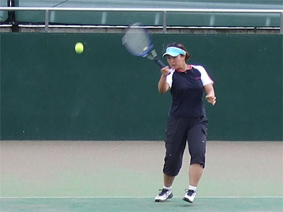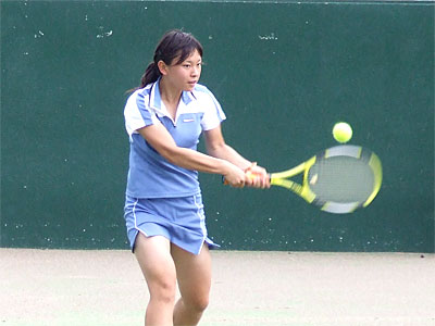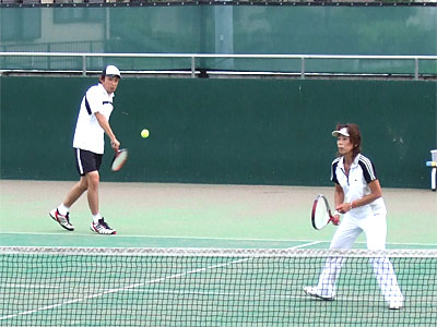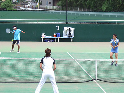 粘りで食い下がったが及ばなかった。 準決勝第2試合、松本・岸本組がネットプレーで攻めたが、井上・内藤組のストロークが 最後まで冴えて、決勝に進出。 | |